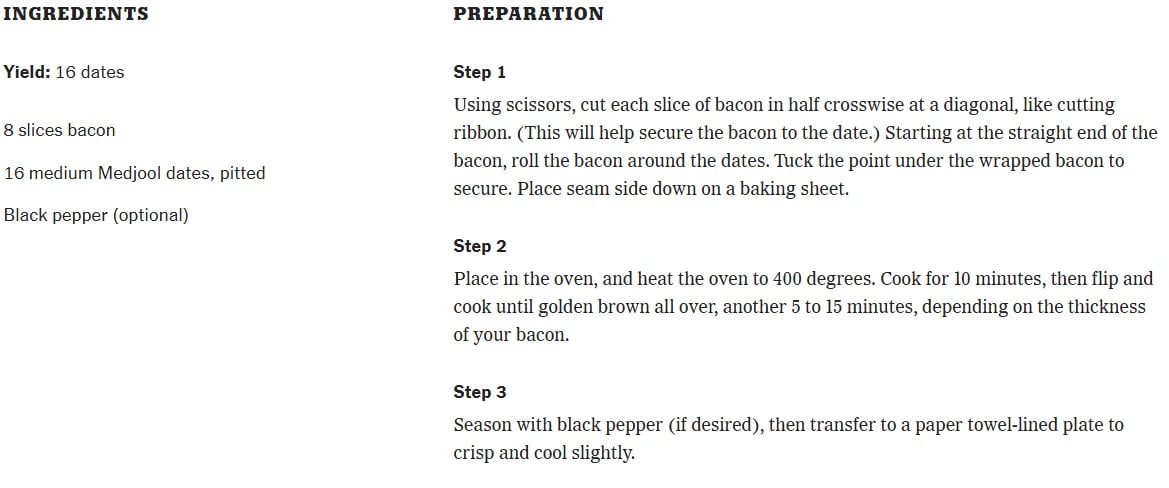 A bacon-wrapped date is sweet, smoky, squidgy and crisp, all in one bite-size package. The trick is getting the bacon to cook before the date burns, and you can do that by starting in a cold oven so that the bacon slowly renders its fat and evenly crisps. While this appetizer was en vogue in the 1970s and 1980s, it has never gone out of style. In fact, it dates back to Victorian England, when bacon-wrapped oysters or prunes (also known as angels or devils on horseback) were eaten before or after a meal. (“Horseback” referred to their being served on toast.)